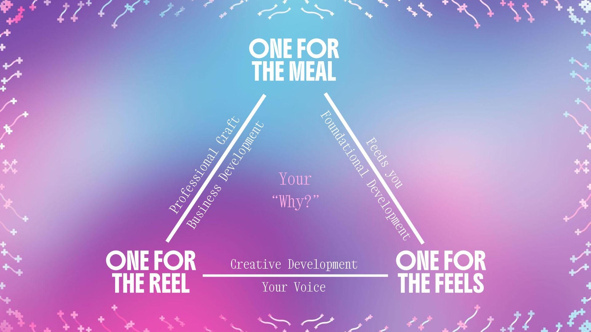 If the rule of thirds can guide how we approach the long game, it can also shape how we think about our creative practice. You may have heard the industry phrase when taking on new work, “one for the reel and one for the meal.” This idea doesn’t always work for me, because it implies that your portfolio piece (the “reel”) is the most fulfilling to you as a creative. But, in fact, that may trap us into feeling confused or empty when our “reel” piece still isn’t fulfilling.